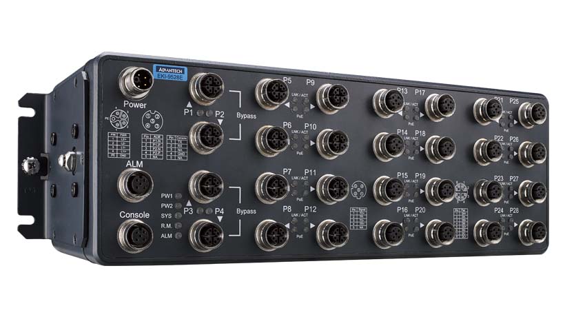 Advantech’s EKI-9528 series Ethernet switch delivers a ruggedized design with high EMC performance to rolling stock, wayside control, and other railroad applications. This solution leverages M12 connectors for Ethernet, console, relay, and power-input — ensuring excellent connectivity and endurance in harsh environments. EKI-9528 accommodates 12 different users’ options. It provides 28 x ports Full Giga Ethernet or 16 x ports Fast Ethernet + 12 Giga (with 4 x Relay Bypass ports) with IEEE802.3af/at PoE function (PoE model only). PoE models deliver 150W of power to cameras, IP-phones, wireless access points, and other devices. In addition, Advantech’s EKI-9528 series features an IP54 certified ruggedized housing and ample pitch connectors that connect/disconnect cables easily. This solution accommodates deployment in compact spaces and delivers mass Ethernet connection.