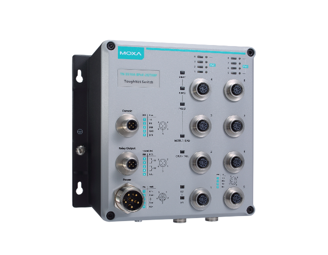 The ToughNet TN-5500A series M12 managed Ethernet switches are designed for railway applications, such as rolling stock, and wayside installations. The TN series switches use M12 and other circular connectors to ensure tight, robust connections, and guarantee reliable operation against environmental disturbances, such as vibration and shock. The TN-5500A series Ethernet switches provide 8 or 16 Fast Ethernet M12 ports with or without 8 IEEE 802.3at/af compliant PoE (Power-over-Ethernet) ports. The PoE switches are classified as power source equipment (PSE) and provide up to 30 watts of power per port, and can be used to power IEEE 802.3at/af compliant powered devices (PDs), such as IP cameras, wireless access points, and IP phones. In addition, the 24 to 110 VDC wide power input range and isolated power inputs not only allow you to use the same type of power source at different sites around the globe, but also increase the reliability of your communications system. In addition, the -40 to 75°C operating temperature and IP54-rated waterproof enclosure allow deployment in harsh environments. Moreover, the TN-5500A series is compliant with the essential sections of EN 50155, covering operating temperature, power input voltage, surge, ESD and vibration, making the switches suitable for a variety of industrial applications.