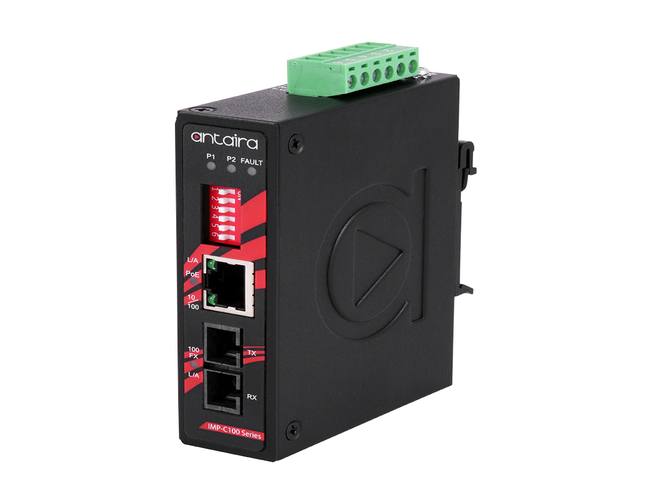 Antaira Technologies' IMP-C100-S3-T is a compact IP30 rated Ethernet-to-fiber media converter featuring a 10/100TX Ethernet port that supports IEEE 802.3at high power PoE that can supply up to 30 watts, and a fixed fiber interface supporting ST and SC connectors depending on the model. There are Multi-Mode and Single-Mode models to support applications with a variety of fiber distances and types. It is designed to fulfill industrial applications that require fiber optic distance extension while using minimal spaceThe IMP-C100-XX series has a built-in "Link Fault Pass Through' (LFP) and "Far End Fault' (FEF) function with 48~55VDC redundant power inputs with reverse polarity and overload current protection. This product series supports DIN-Rail as well as wall mountable orientations and provides an operating temperature range model in EOT: -40C to 80C.
