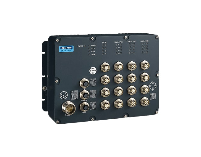 EKI-9516DP M12 Managed Ethernet Switch is designed for railway applications, including rolling stock. EKI-9516DP switch uses M12 connectors to ensure tight, robust connections, and to guarantee reliable operation against environmental disturbances, such as vibration and shock. EKI-9516DP provides 16 10/100 Mbps Ethernet M12 ports with 12 IEEE 802.3at/af compliant PoE /PoE ports. The PoE /PoE switch is classified as power source equipment (PSE) and provides up to 90 watts of power per system, and can be used for IEEE 802.3at/af compliant powered devices (PDs), such as IP cameras, wireless access points, and IP phones. In addition, EKI-9516DP provides a wide power input range of 24/36/48 VDC, 72/96/110 VDC; the dual, isolated power input increases the reliability of your communications system. The -40 to 70° C operating temperature and IP67-rated waterproof enclosure allow deployment in harsh environments. EKI-9516DP is compliant with the essential sections of the European railway standard EN 50155, EN50121-3-2 covering operating temperature, power input voltage, surge, ESD, and vibration, making the switches suitable for a variety of industrial applications.
