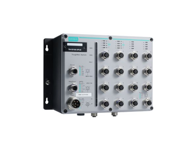 The ToughNet TN-5500A series M12 managed Ethernet switches are designed for railway applications, such as rolling stock, and wayside installations. The TN series switches use M12 and other circular connectors to ensure tight, robust connections, and guarantee reliable operation against environmental disturbances, such as vibration and shock. The TN-5500A series Ethernet switches provide 8 or 16 Fast Ethernet M12 ports with or without 8 IEEE 802.3at/af compliant PoE (Power-over-Ethernet) ports. The PoE switches are classified as power source equipment (PSE) and provide up to 30 watts of power per port, and can be used to power IEEE 802.3at/af compliant powered devices (PDs), such as IP cameras, wireless access points, and IP phones. In addition, the 24 to 110 VDC wide power input range and isolated power inputs not only allow you to use the same type of power source at different sites around the globe, but also increase the reliability of your communications system. In addition, the -40 to 75°C operating temperature and IP54-rated waterproof enclosure allow deployment in harsh environments. Moreover, the TN-5500A series is compliant with the essential sections of EN 50155, covering operating temperature, power input voltage, surge, ESD and vibration, making the switches suitable for a variety of industrial applications.