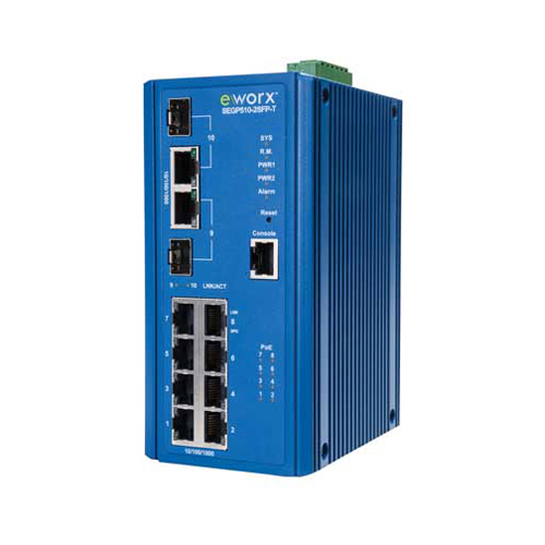 The SEGP500 series SEGP510-2SFP-T is a fully managed PoE+ Gigabit Ethernet switch with industrial, ruggedized features designed to work in harsh environment applications. This switch offers all the features expected in a managed switch such as VLAN, IGMP Snooping, Network Redundancy, Link Aggregation, SNMP V1,V2c,V3, Web and Telnet support. Smart PoE Management features allow advanced PoE settings and monitoring. Comprehensive network security features such as SSH, HTTPS/SSL, TLS, TTLS, PEAP and Radius are also offered.