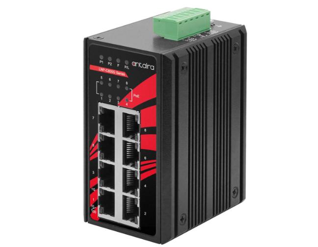 Antaira's LNP-C800G-T industrial PoE switch has been specifically designed for rugged and harsh environmental deployments. This industrial switch is housed in a hardened IP30-rated metal enclosure that includes DIN-rail and wall mounting hardware. The operating temperature for an extended temperature range is -40°C to 75°C. The LNP-C800G-T industrial Ethernet switch also provides high EFT and ESD protection for any industrial networking application within factory automation, ITS (including on-vehicle), solar, security, or any other outdoor or harsh environment.