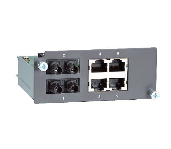 Fast Ethernet Module with 2 multi-mode 100BaseFX ports with ST connectors and 4 10/100BaseT(X) ports with RJ45 connectors