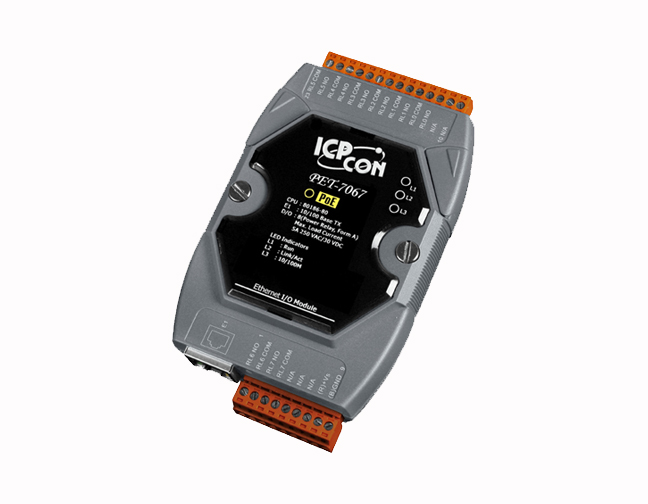 The PET-7067 provides 8 power relay (form A) output channels. Each power relay supports contact rating as 5 A @ 250 VAC or 5 A @ 30 VDC.