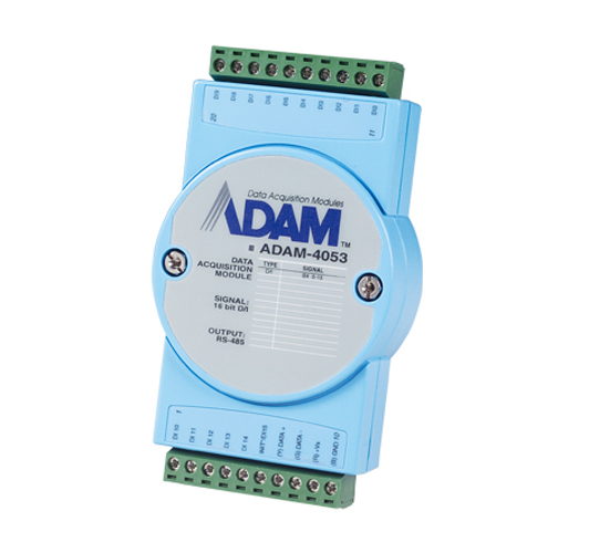 The ADAM-4053 provides 16 digital input channels for dry contact or wet contact signals. For dry contact, effective distance from DI to contact point is up to 500 m.