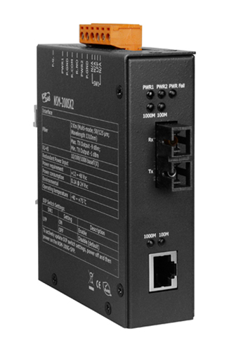 1000 Base-T to 1000Base-LX/SX Fiber Media Converter (SC type connector). +12 VDC ~ +48 VDC (Non-isolated) 2 km distance, 0.1 A @ VDC Power Consumption. Provides Link Fault Pass-through (LFP). Has operating temperature range of -30°C ~ +75°C (-22°F ~ +167°F)