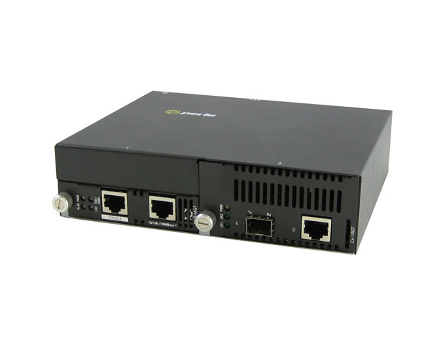 Perle SMI-10GT Media Converters transparently connect 10GBase-T Ethernet links over multimode or single mode fiber inenvironments where network security is critical. The SMI-10GRT additionally supports 10/100/1000/2500/10000 rate conversion. Each 10GBASE-T Media Converter comes with one RJ45 10GBase-T port and an empty slot for one SFP+ or XFP module.