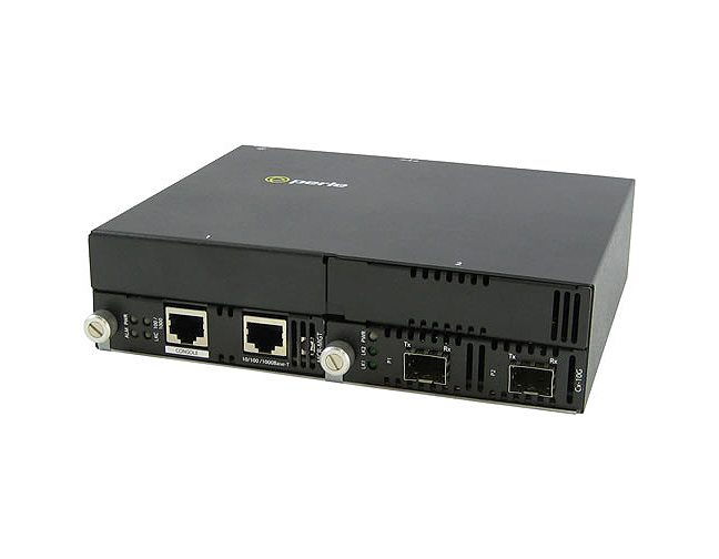 Perle SMI-10G Managed Media Converters transparently connect 10 Gigabit Ethernet links over multimode or single mode fiber in environments where network security is critical. Each 10GbE Media Converter comes with two pluggable transceiver ports that support fiber to fiber, copper to fiber or copper to copper media conversion.