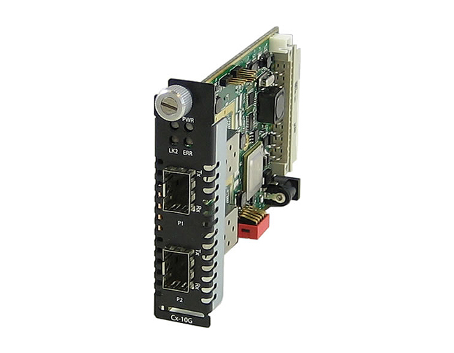 Installed in a high density MCR1900 Media Converter Chassis, Perle CM-10G Media Converter Modules transparently connect 10 Gigabit Ethernet links over multimode or single mode fiber. Each 10GbE Media Converter comes with two pluggable transceiver ports that support fiber to fiber, copper to fiber or copper to copper media conversion. These media converters can be used in an unmanaged environment or can be SNMP manageable to enable complete control and status viewing of your fiber links. 10G Media Converter Modules are also available for unmanaged networks, or for low to mid-density application check out the stand alone SMI-10G Managed Media Converter.