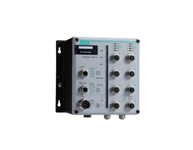 The ToughNet TN-5510A-8PoE series,TN-5510A-8PoE-2GTXBP-WV-CT-T, M12 managed Ethernet switches are designed for railway applications, including rolling stock and wayside installations. The switches use M12 and other circular connectors to ensure tight, robust connections, and guarantee reliable operation in industrial environments where vibration and shock are commonplace. The TN-5500A series Ethernet switches have 8 Fast Ethernet M12 ports with 8 IEEE 802.3at/af compliant PoE (Power-over-Ethernet) ports and 2 ports on the down side to provide the Gigabit Ethernet interface with an optional bypass relay function. The PoE switches are classified as power source equipment (PSE); they provide up to 30 watts of power per port, and can be used to power IEEE 802.3at/af compliant powered devices (PDs), such as IP cameras, wireless access points, and IP phones. The 24 to 110 VDC wide power input range and isolated power inputs not only allow you to use the same type of power source at different sites around the globe, but also increase the reliability of your communications system. Furthermore, the -40 to 75°C operating temperature and IP54-rated waterproof enclosure allow deployment in harsh environments. The TN-5500A series Ethernet switches are compliant with mandatory sections of EN 50155, covering operating temperature, power input voltage, surge, ESD, and vibration, as well as conformal coating and power insulation, making the switches suitable for a variety of industrial applications.