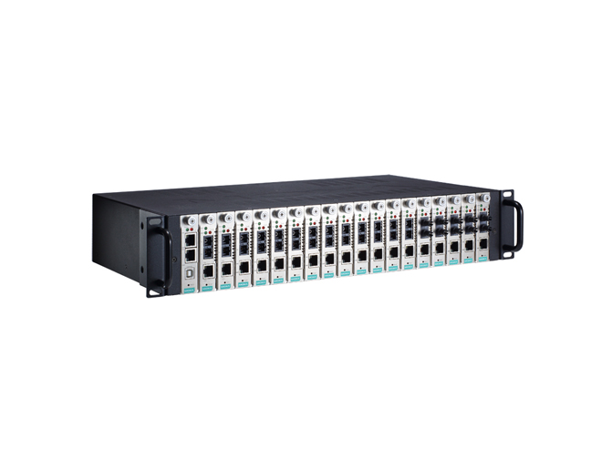 Moxa TRC-2190-DC-48V - 2U Rackmount chassis, with a single 36 to 53 VDC input, 18 slots on the front panel, and CSM-MN01 managed by MOXA