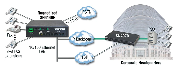 Patton SmarNote SN4140EThe ruggedized SN4140E Industrial VoIP Gateway series is ideal for delivering Voice-over-IP telephony for outdoor phone, industrial VoIP, and tactical communications systems in outdoor or environmentally exposed environments where heating and cooling cannot be controlled. Features: • Up to 8 FXS and/or FXO ports • Advanced Local Call Switching • Complete SIP and T.38 support • Easy Management & Provisioning • Outstanding Interoperability • Protection against power spike and surge is built in Application: • industrial automation • military communications • railways • public transportation • public and private outdoor phones, including emergency phones in parking lots, along roadways and railways and within underground tunnels