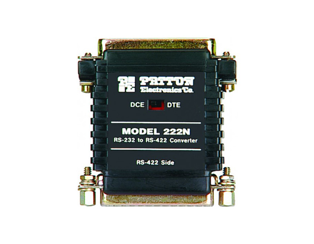 The Patton Model 222NSFRJ11 Series of converters now comes in two "flavors": The Model 222N allows an RS-232 device with DB-25 port to connect to an RS-422 device up to 4000 feet away over two twisted pair. The Model 222N9 does the same thing for an RS-232 device with a DB-9 port (now called EIA-574). Both converters support data rates up to 19.2 kbps, and require no AC power or batteries for operation. All handshaking lines are looped back. The Model 222NRC is a dual rack card version of the Model 222N, with two converters in one card!
