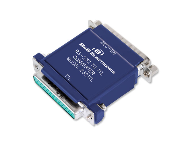 The 232TTL converts RS-232 to TTL levels. Two channels are used to convert from RS-232 to 0 to +5 VDC TTL signals and two channels are used to convert from 0 to +5 VDC TTL signals to RS-232. This converter supports RD, TD, RTS, and CTS. The DB25P male connector (DCE) is for the RS-232 side. The DB25S female connector is for the TTL side.