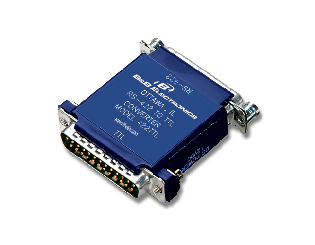 The 422TTL and 422TTL33 convert RS-422 or EIA-530 signals to TTL at data rates up to 115.2 Kbps. Two channels are used to convert RS-422 to TTL and two channels are used to convert TTL to RS-422. Select the 422TTL for 5 VDC TTL or the 422TTL33 for 3.3 VDC TTL. A DB25 Male connector is used on the TTL side and a DB25 Female connector is used on the RS-422 / EIA-530 side. The converters support RD, TD, RTS, and CTS.
